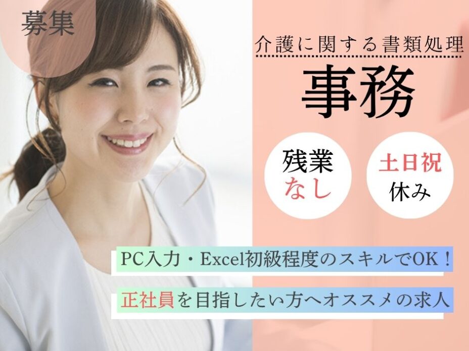 仕事内容 | \土日休みで残業ほぼナシ♪/ 正社員登用を目指せる、介護関係の事務のお仕事です ▼仕事内容 ・介護保険請求業務 ・経理書類の管理 ・電話対応、来客対応 ・物品の管理 ・ヘルパーさんの給与計算 将来的に「正社員転籍」の可能性があります。 キャリアアップも目指せます! ◎ポイント ・土日休み×残業ほぼナシでプライベート充実! ・正社員登用あり ・事務未経験OK! |