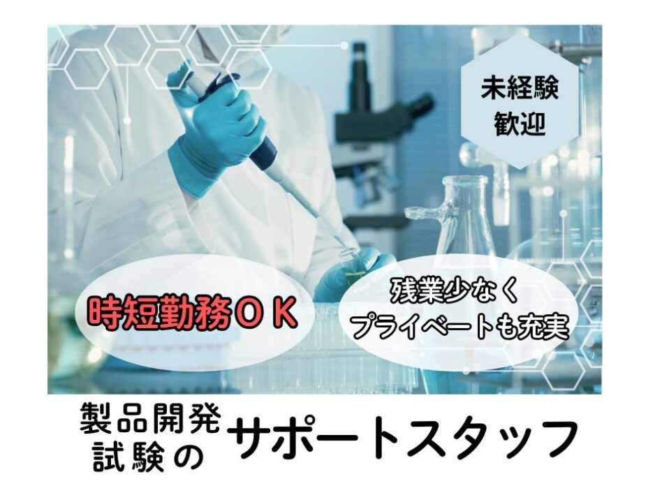 研磨材で世界トップクラスシェアのメーカーで 開発サポートのお仕事です! ◆仕事内容 ・研磨材開発の試験サポート業務 液体の調合・分析・研磨の評価・試作作業 ・測定装置の操作 ・測定結果をPCに入力 ・その他片付けなど \各作業についてはイチから丁寧に教えてもらえます!/ 未経験の方でも安心してスタートできます 【時短勤務OK!】 例えば9:00~16:00や、10:00~17:00など 6時間以上であれば時短勤務OK! お気軽にご相談ください♪ ◆ポイント ・業界トップシェアのメーカーだから長期安定◎ ・空調完備で快適作業 ・手順通りの作業でもくもくコツコツ作業 ・いちから丁寧に教えてもらえるので未経験の方も安心♪ ・残業少なめなのでプライベートも充実◎